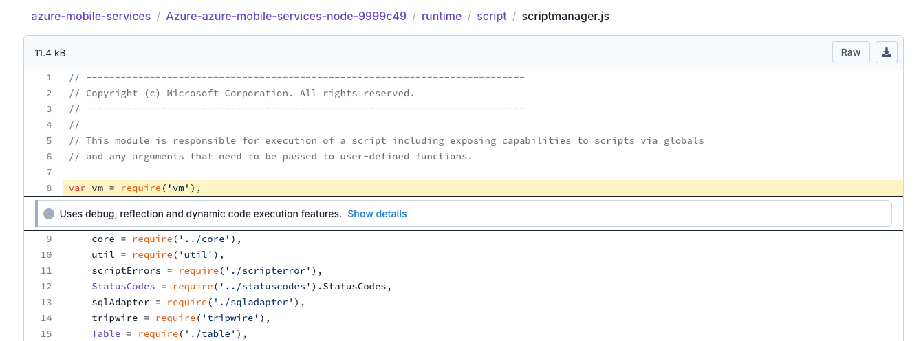 Here is an example of a package flagged for Debug Access due to the use of the vm module. While the vm module offers some isolation, it does not fully protect against malicious code or side-channel attacks. It could potentially allow dynamic code execution increases the attack surface, especially if user-provided scripts are not properly validated or sanitized.