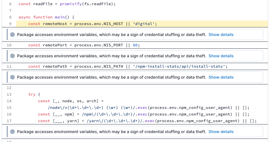 Here's an example where a package is using process.env in multiple instances, which triggered the Environment Variable Access alert: