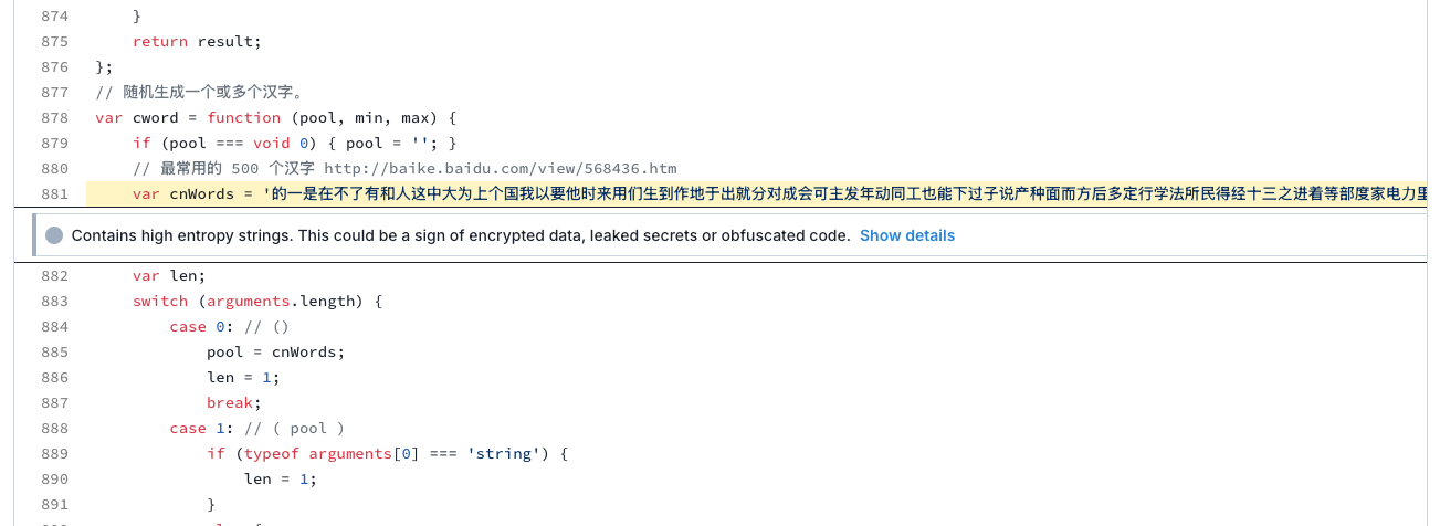 Here is an example of a package flagged for high entropy stringsdue to its dense and seemingly random nature (a large collection of unrelated Chinese characters), which could resemble obfuscated data. It's best to review these instances to ensure they are benign before including these dependencies in your code base.