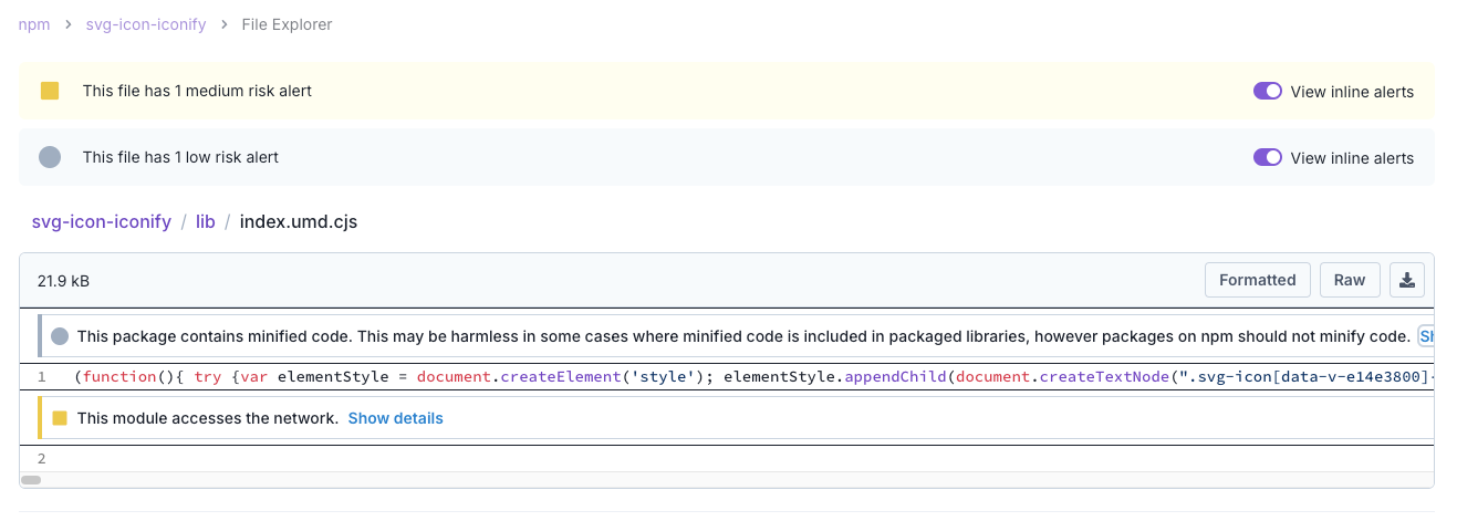 This alert indicates that the package contains minified code. While minified code may be harmless in some cases, such as when it is part of a packaged library, it is generally recommended that packages published on npm do not include minified code.