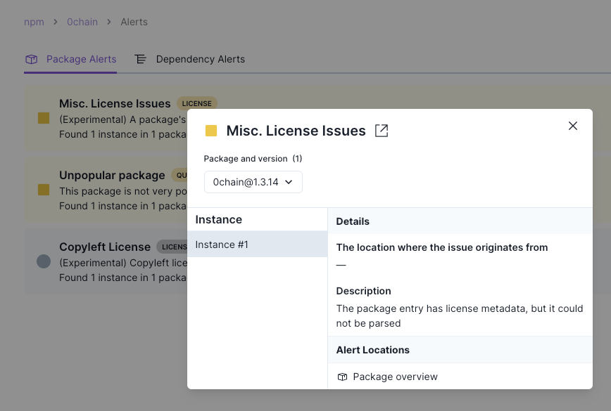 In this example, the package was flagged because its entry has license metadata but it could not be parsed. Its npm metadata is an invalid SPDX expression and can't be parsed as license data.