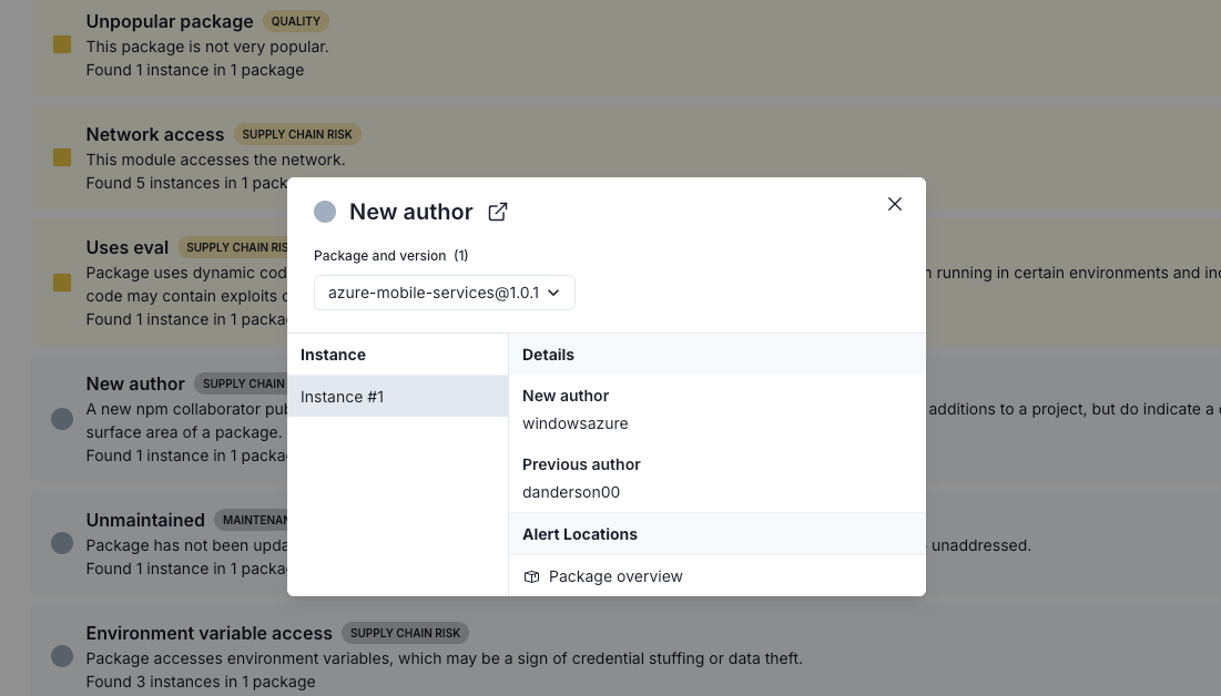Here's an example where an npm package changed authors from one version to the next. The new author and previous author are noted in the alert: