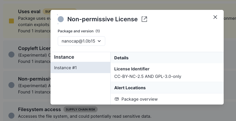 Here's an example of a package flagged as having a Non-Permissive license. In this case, it's the CC-BY-NC-2.5 license, which restricts the use of the work to non-commercial purposes, limiting how it can be used and distributed.