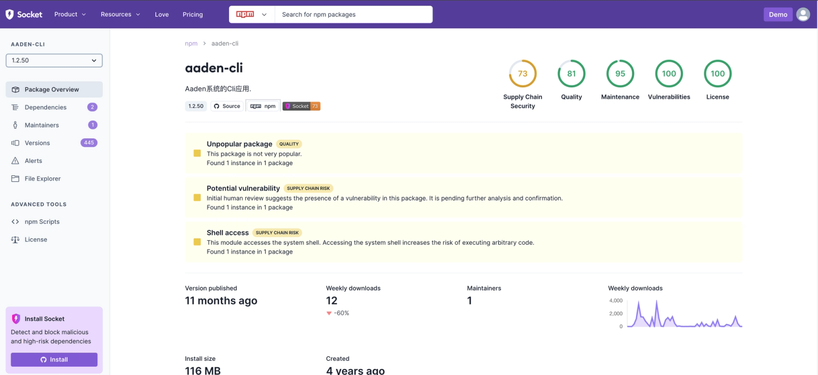 aaden-cli package has been flagged with a potential vulnerability. Initial human review suggests that this package may contain security risks. The vulnerability is pending further analysis and confirmation. This package also accesses the system shell, which increases the risk of executing arbitrary code. Additionally, it is noted as an unpopular package, which may contribute to its security risks due to limited community review and oversight.