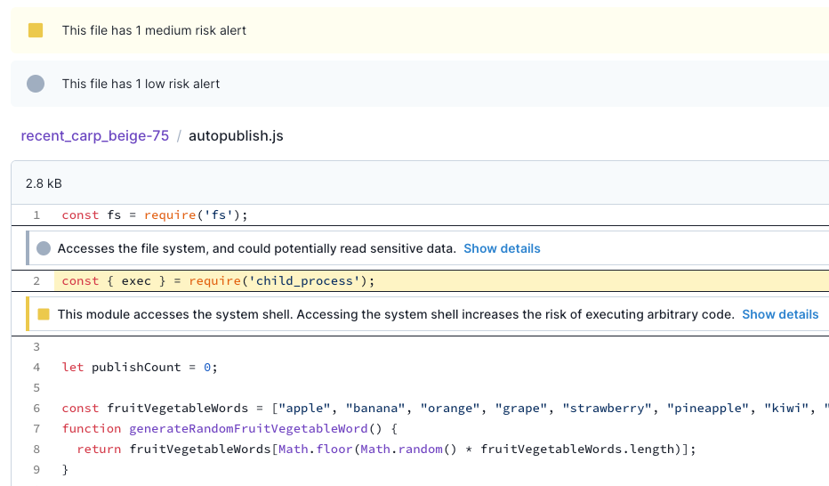 Here's an example where Socket has flagged a package for Shell Access due to the use of the child_process module: