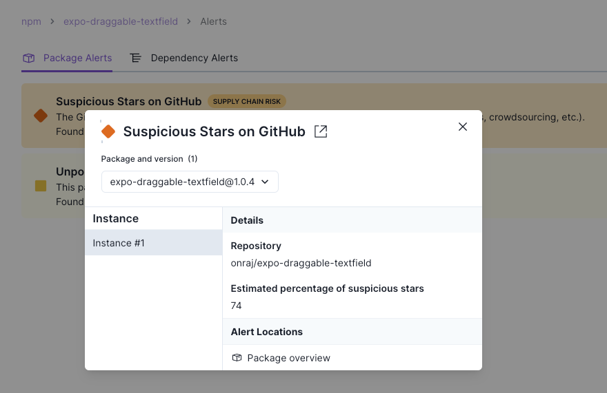 Packages flagged with this alert link to the package overview page. It also gives an estimate for the percentage of suspicious stars.