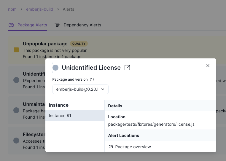 LICENSE file, package.json) to manually identify the license. This is especially important if the license is custom or uncommon.Here is an example where Socket detected a file that appears to be a license but could not determine a match with a known license. The alert identifies the specific file that caused the package to be flagged.
