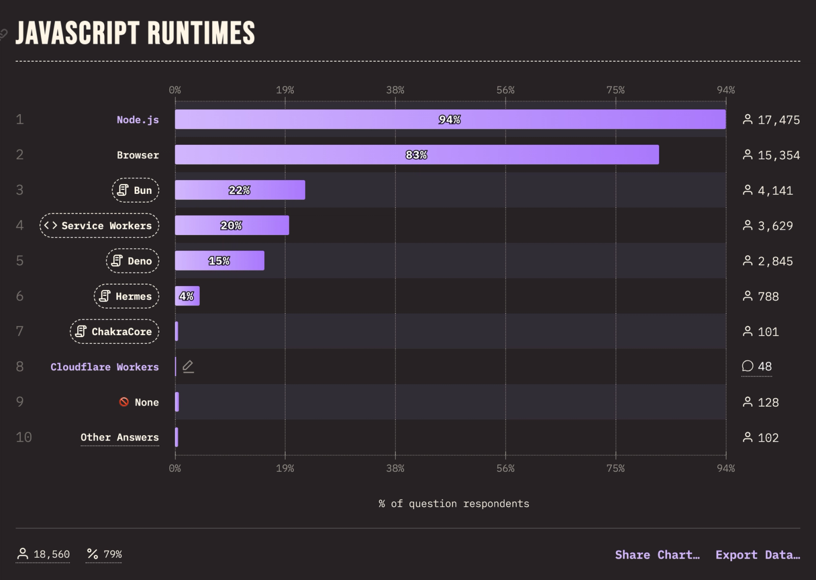 Unsurprisingly, Node.js tops the JavaScript runtimes, and is used by 94% of respondents. Bun sits at 22% and won the most write-ins, with 353 mentions. The survey’s creators found Bun was the most mentioned technology overall in freeform questions. Newcomer Deno, which requires zero configuration for TypeScript, is steadily rising at 15%.