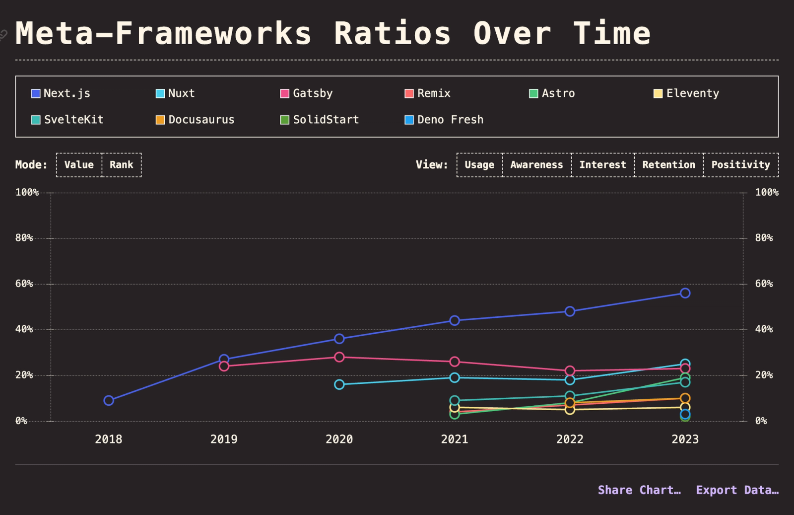 Next.js, which provides React-based web applications with server-side rendering and static website generation, is the clear winner among meta frameworks - those focused on rendering and serving applications. Shiny new newcomers like Remix, Astro, and SvelteKit are on the rise but still hover at just under 20% of respondents in terms of usage. Retention of Next.js is slightly down, from 89% in 2022 to 75% in 2023.