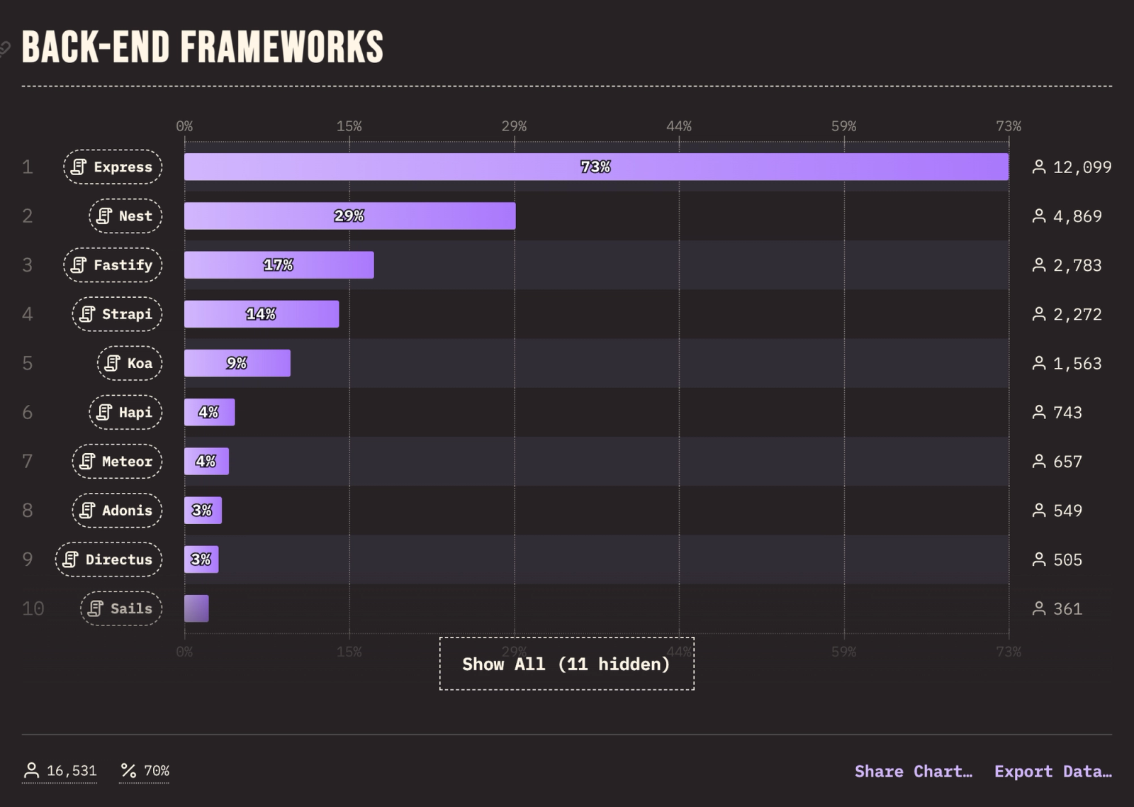 For those using JavaScript on the backend, Express is by far the most popular choice, used by 73% of respondents, reflecting its long-standing popularity and robust ecosystem. Nest sits at 29%. Its appeal likely stems from its modular architecture and full support for TypeScript. Fastify, known for its performance and low overhead, is gaining traction at 17%.