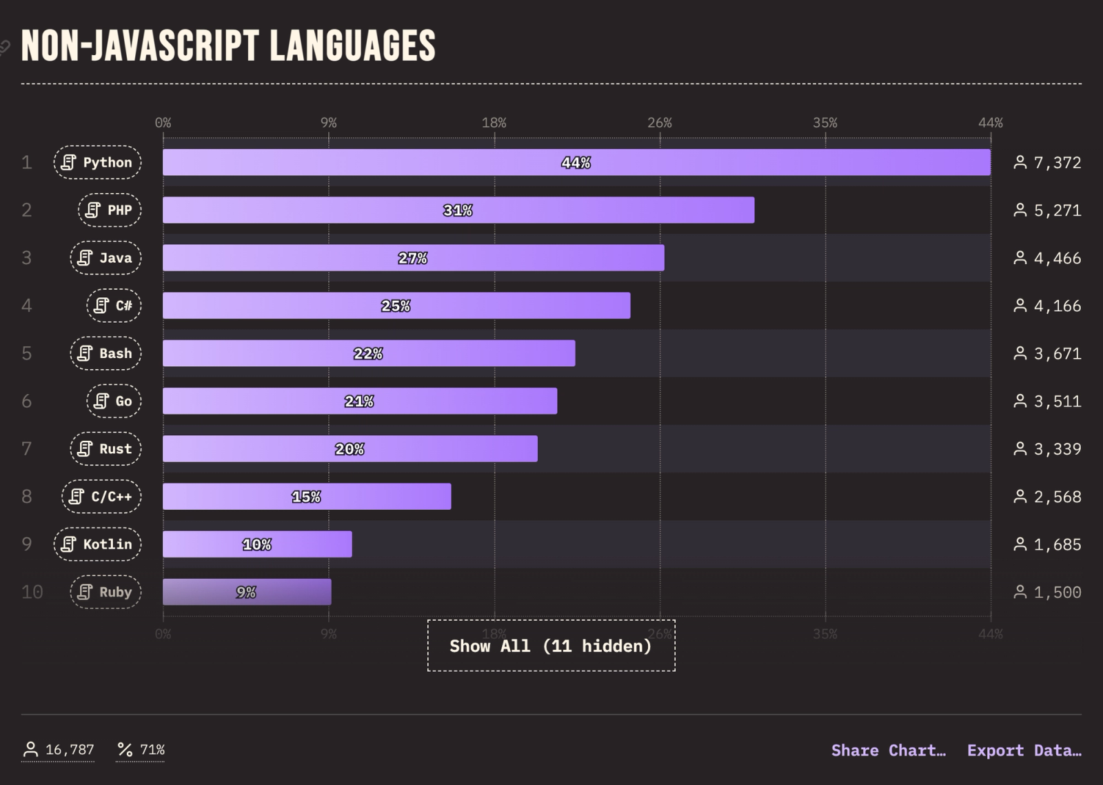 Python is by far the respondents’ most favored non-JavaScript language, with 44% using it. Its popularity is likely due to its versatility, ease of learning, and extensive libraries, particularly in data science, machine learning, and web development. Evergreen PHP and Java, used by 31% and 27% of respondents respectively, continue to hold strong positions due to their widespread use in web development, enterprise environments, and mobile application development.