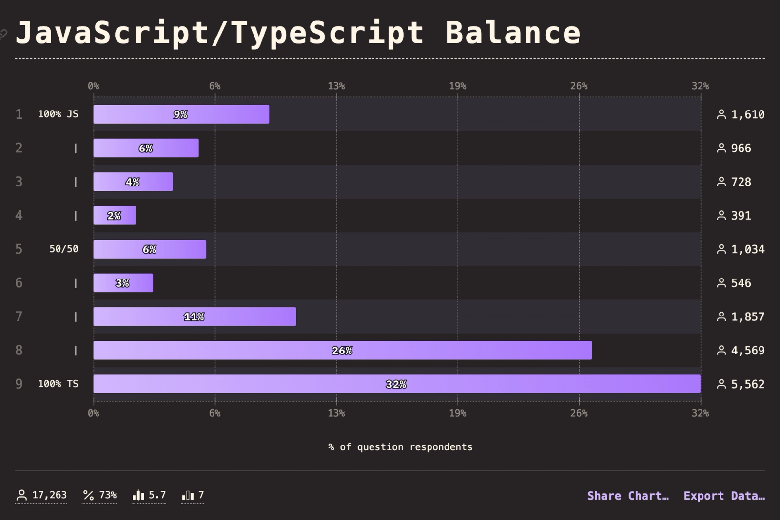 When asked, “How do you divide your time between writing JavaScript and TypeScript code?” respondents revealed a clear trend towards TypeScript adoption.