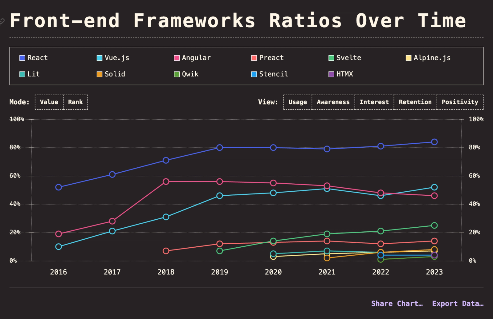 Interest in all frameworks across the board is on the decline, which might indicate that developers are taking a conservative wait-and-see approach as they evaluate the long-term viability of these newer frameworks.