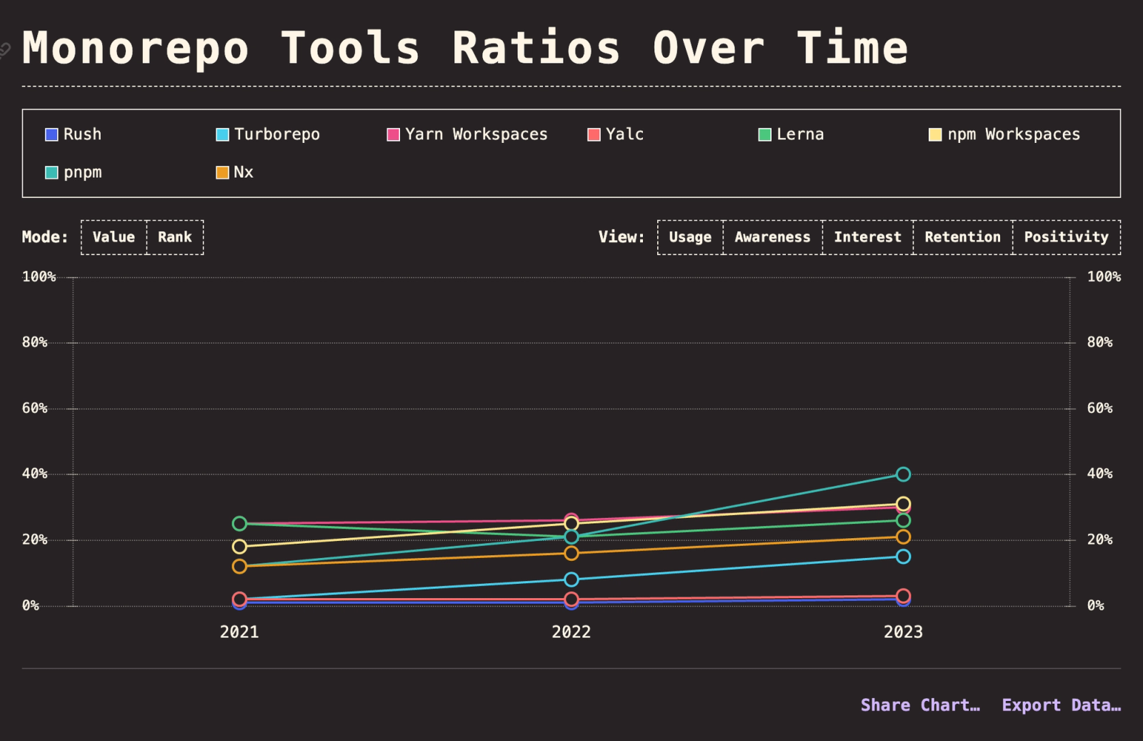 The monorepo tools are a diverse set of solutions that all seem to be neck-and-neck in terms of usage, with no tool used by over 40% of respondents. Interest in the various tools is declining across the board, as well as retention, with the exception of pnpm, where retention has been stable. pnpm also had the biggest jump in positive sentiment.