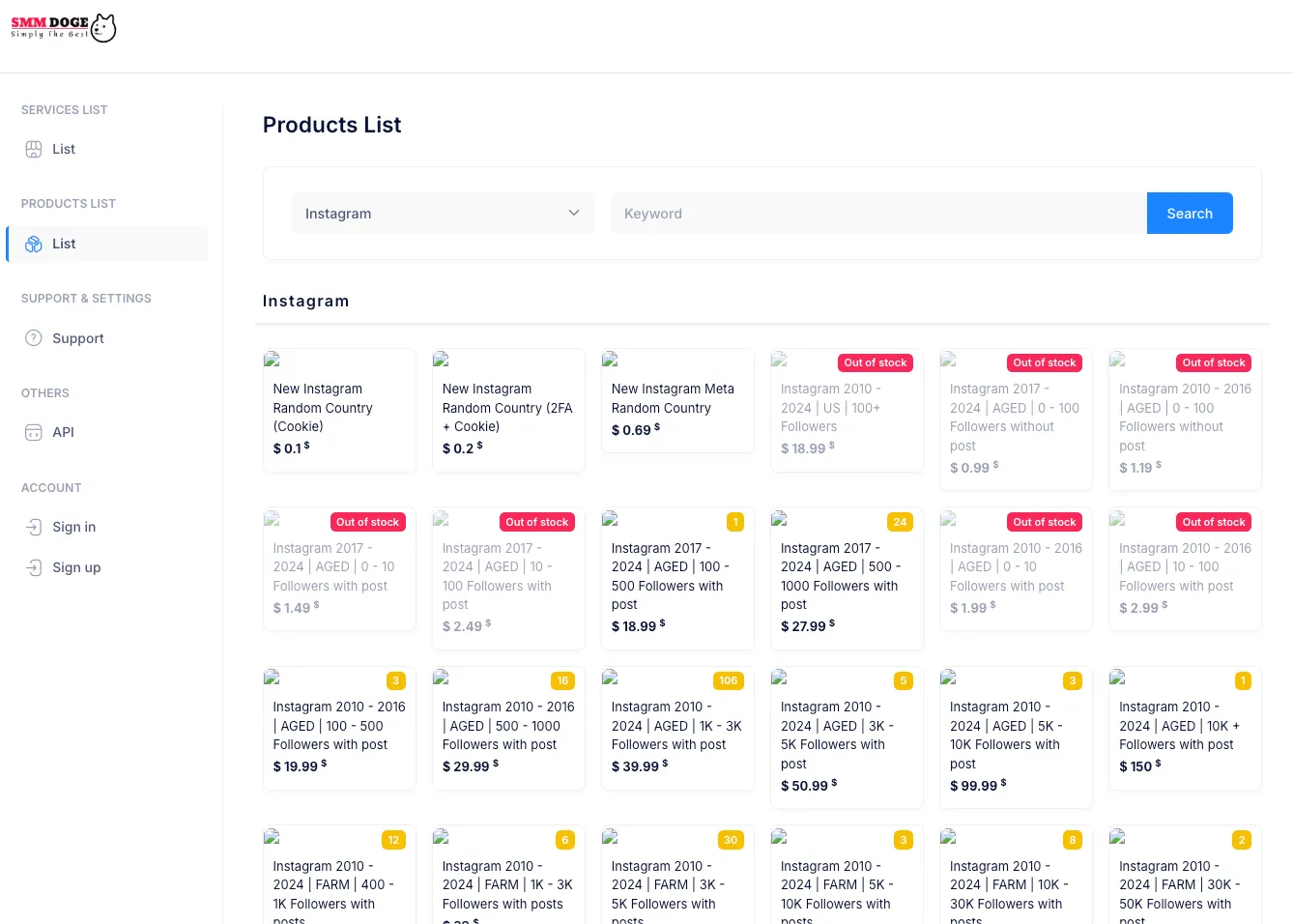 Screenshot from smmdoge[.]com, an SMM panel offering bulk account and engagement services across Instagram, TikTok, YouTube, and more. Listings include aged and farmed accounts with posts, 2FA credentials, cookies, and follower counts ranging from 10 to 50,000+. These offerings enable mass automation, spam, fake engagements, and synthetic identity operations.
