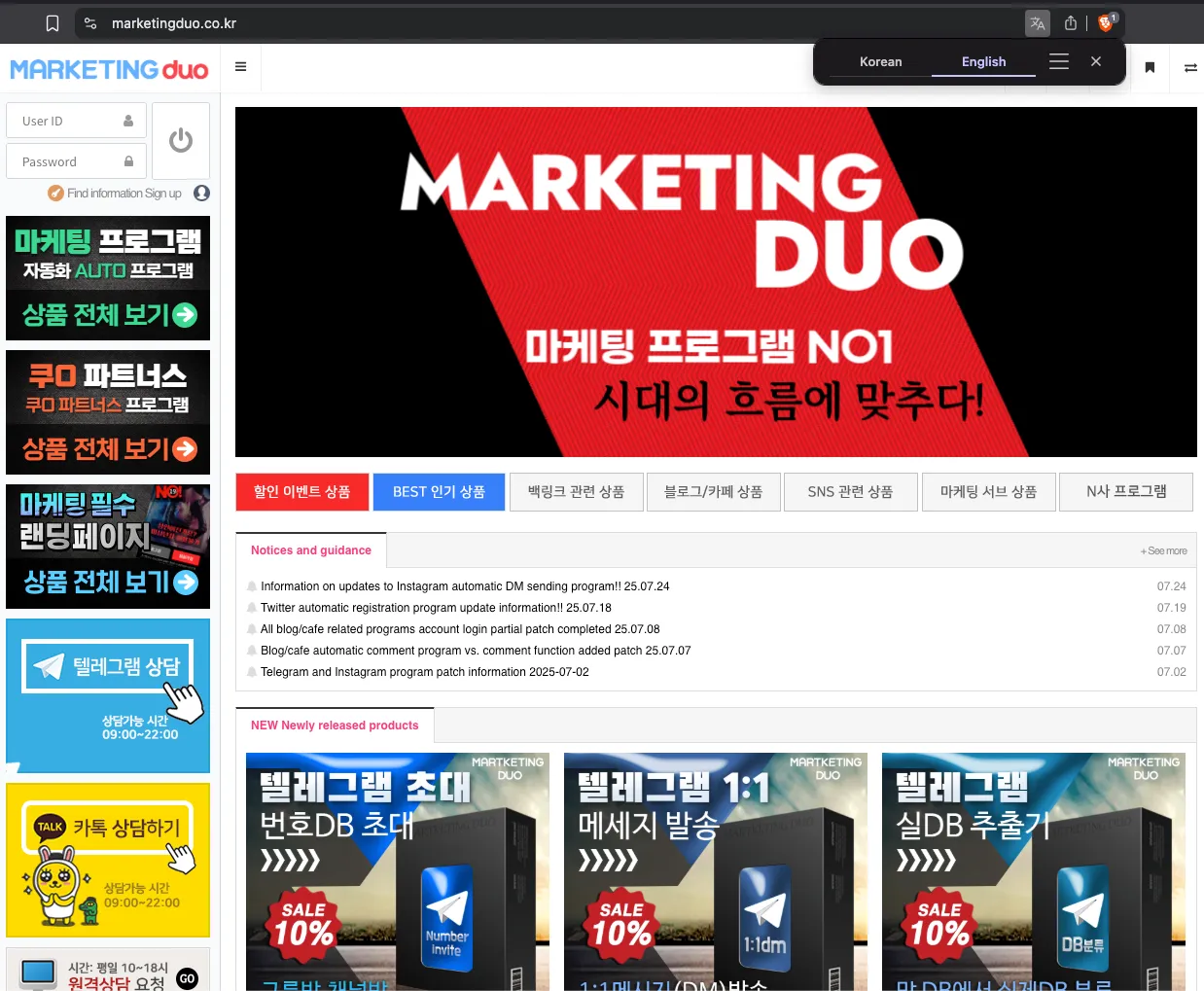 Screenshot from marketingduo[.]co[.]kr, a Korean-language platform offering bulk messaging, phone number scraping, and automated social media tools. The site promotes Instagram, Telegram, and blogging automation products, targeting grey-hat marketers seeking mass engagement and large-scale posting capabilities. Identical interfaces are also hosted on related domains operated by the threat actor, including programzon[.]com, appspace[.]kr, and seven1.iwinv[.]net.