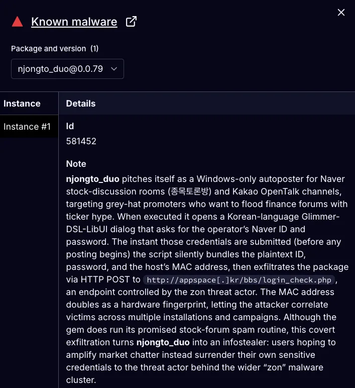 Socket AI Scanner’s analysis of the malicious njongto_duo RubyGem reveals its dual function as both a stock forum autoposter and an infostealer. While it advertises bulk-posting automation for stock discussion boards, the gem covertly exfiltrates plaintext credentials and MAC addresses to a C2 endpoint (appspace[.]kr/bbs/login_check.php) controlled by the threat actor.