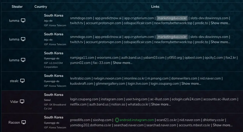 Logs advertised and sold on dark web marketplaces such as Russian Market show that infected systems interacted with marketingduo[.]co[.]kr while logged in, confirming the victims were active customers of the service.