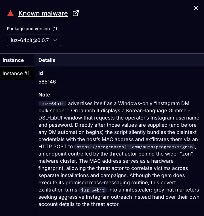 The credential theft functionality has persisted throughout the RubyGems malware campaign, which has been active since at least March 2023. Across four RubyGems aliases, the threat actor published 60 malicious gems in coordinated waves. Each wave introduced support for a new platform, beginning with TikTok and gradually expanding to more complex automation targeting Instagram, Twitter/X, Telegram, Naver, WordPress, and other ecosystems. The campaign follows a regular cadence, with approximately one new cluster published every two to three months.