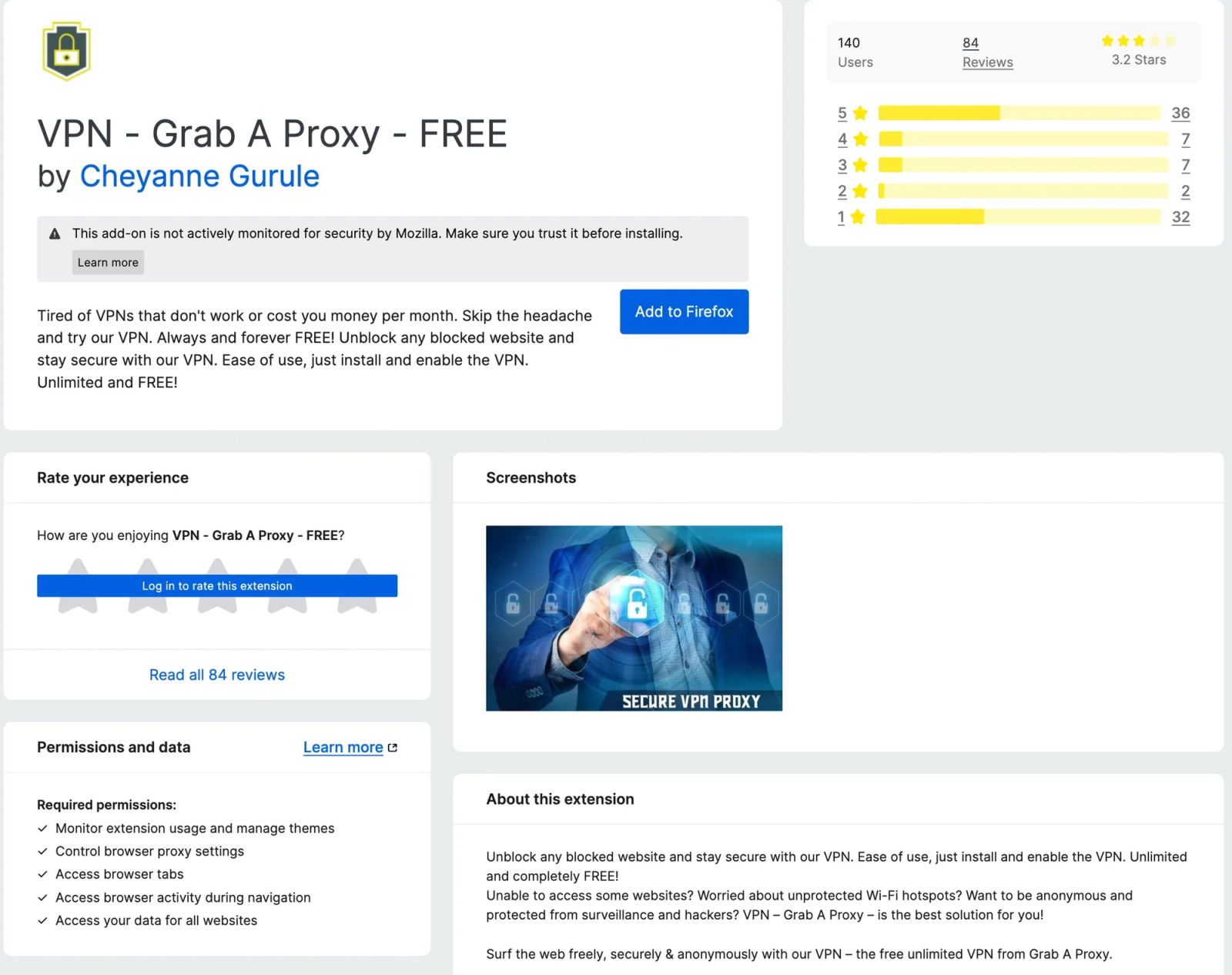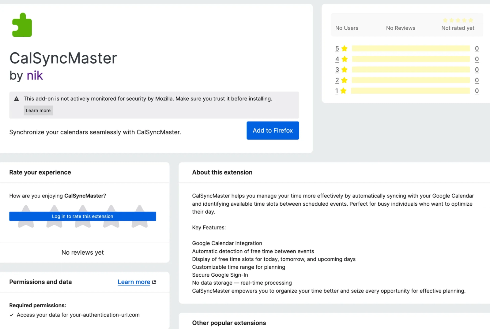 Mozilla browser extension VPN-Grab A Proxy-Free"CalSyncMaster" represents the most serious threat in our analysis, moving beyond simple redirects and affiliate fraud to actual credential theft. This extension poses as a legitimate Google Calendar synchronization tool but implements an advanced credential theft operation. The extension exploits users' trust in OAuth flows and calendar management needs to steal Google Authentication tokens that provide ongoing access to sensitive personal and business data.