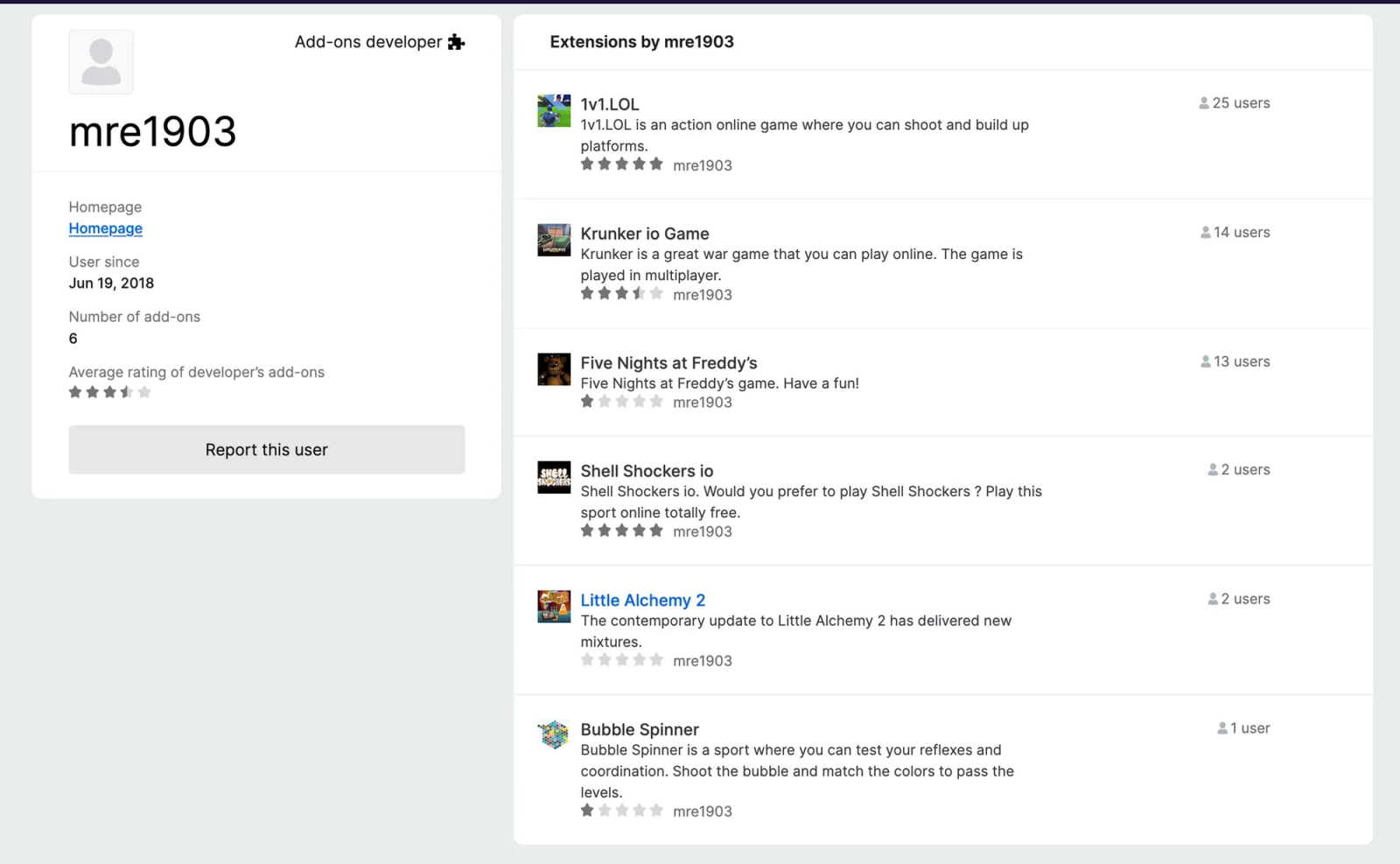 Initially investigating the "Shell Shockers" extension, we found multiple extensions from the same threat actor mre1903 employing similar deceptive practices across various fake gaming extensions. Each extension masquerades as popular, well-known games to exploit user familiarity and trust. The most concerning example is Little Alchemy 2 - a hugely popular puzzle game with millions of players worldwide. By impersonating this beloved game, the extension immediately gains user trust and bypasses initial skepticism.