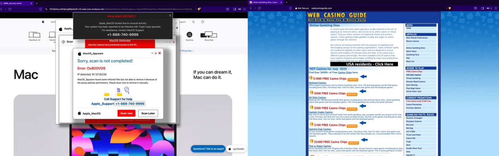 mre1903’s extensions redirecting to Fake Apple Virus alerts and shady betting websitesRisk: The use of popular game names makes these extensions particularly dangerous because users don't expect malicious behavior from familiar, trusted games. Redirected users are exposed to scam operations including fake Apple virus alerts with error codes like "0x800VDS" and fraudulent support numbers designed to extract personal information and money.