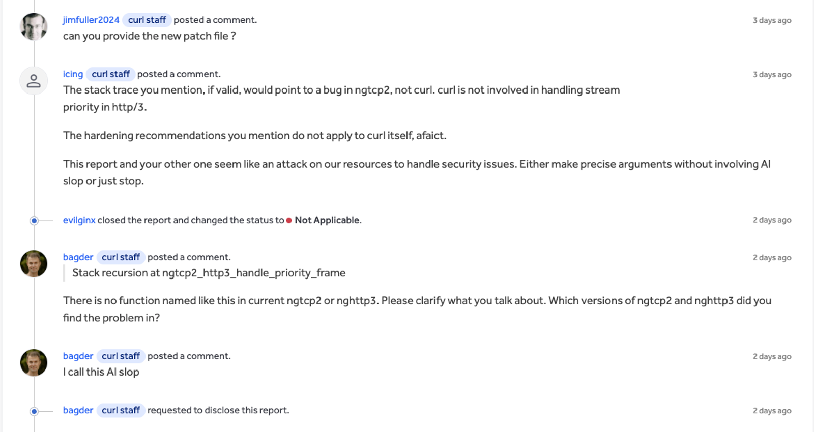 Submitting fake or low-quality reports can lead to a loss of reputation on HackerOne, which limits how many reports a user can submit and reduces their access to private programs. This may not be enough to deter the growing problem of AI slop reports. In this particular instance the reporter closed the report and changed the status to "Not Applicable," which does not impact reputation. The curl project elected to disclose the report.