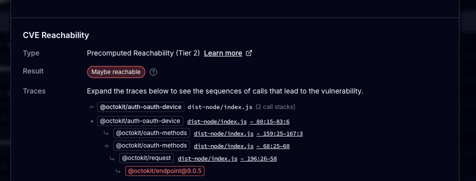 If the analysis found the vulnerability to be maybe reachable, it provides an exact trace from the dependency where the vulnerability is in use to the vulnerable function.