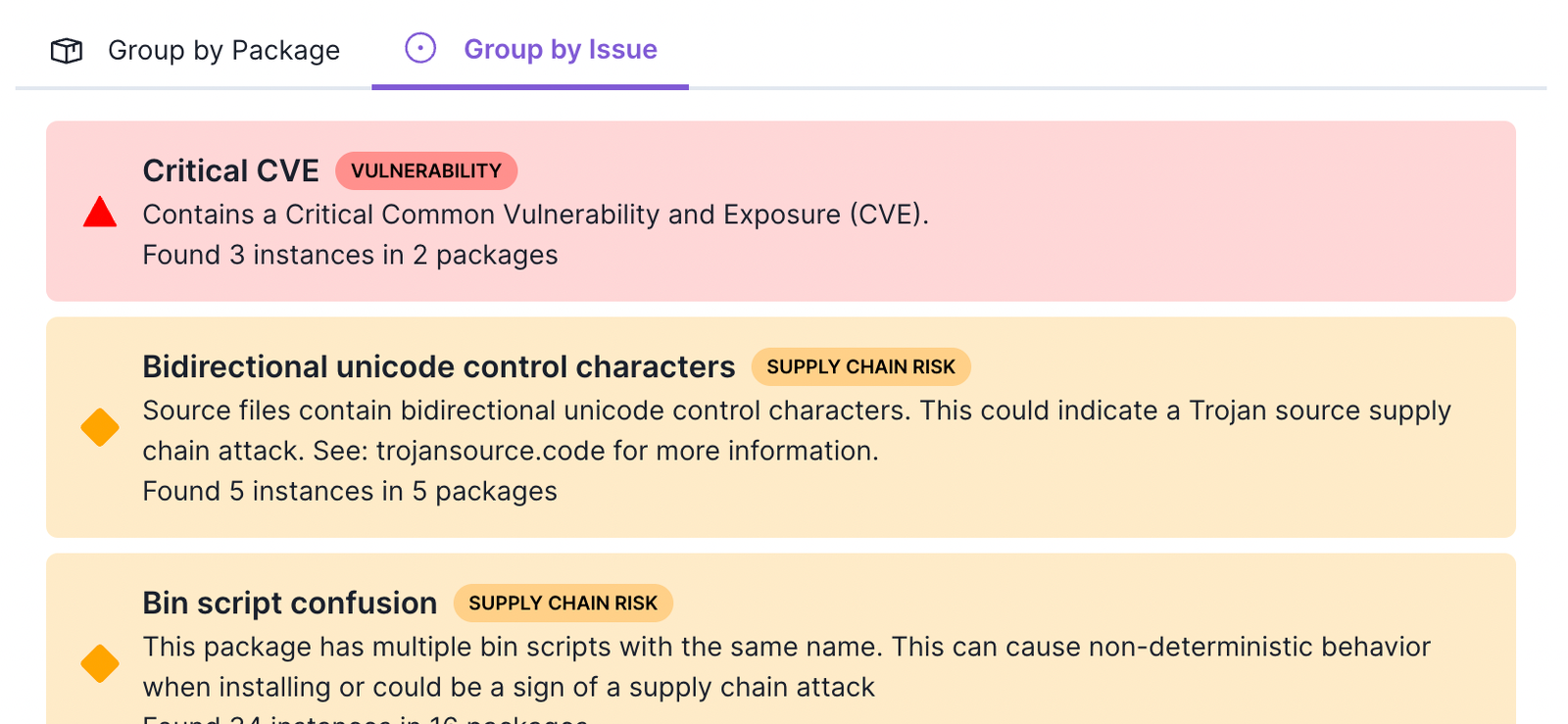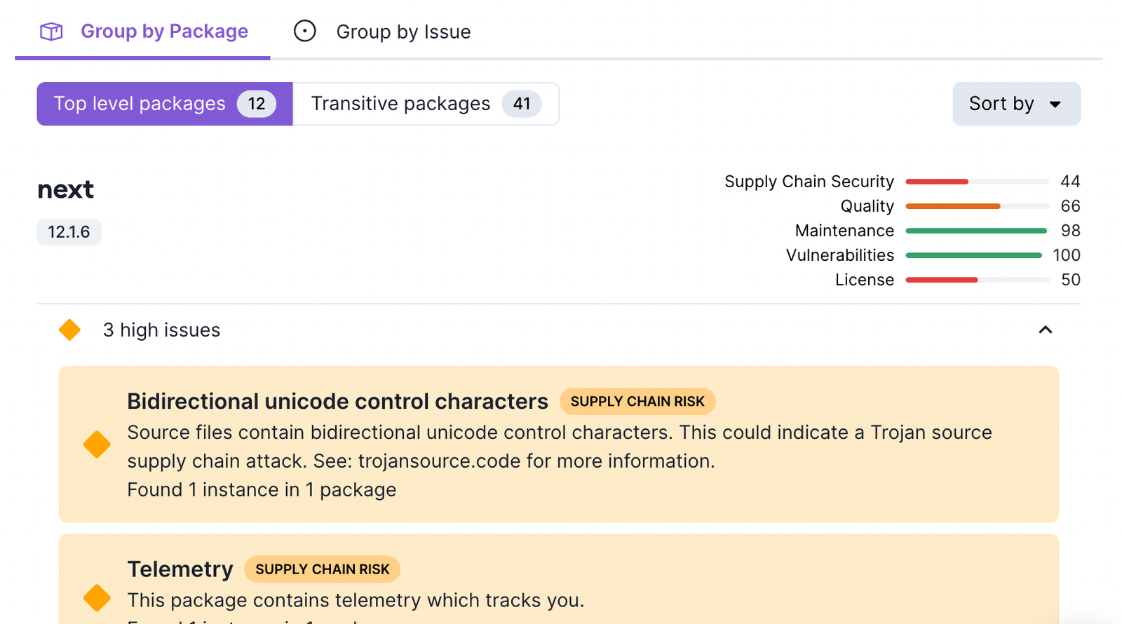 Additionally, navigating by issue may be important as it can help understand all the location that are pulling in an issue to see if it is only caused by a single package or if it is coming from multiple packages.