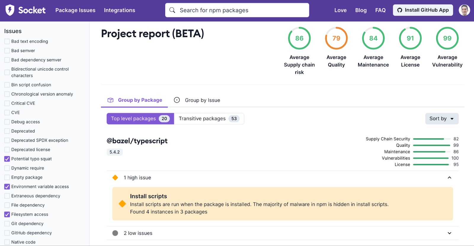 Once acceptable filtering is achieved for a report understanding the causes of issues can also be useful. Socket provides a few helpful view to assist navigating the issues: