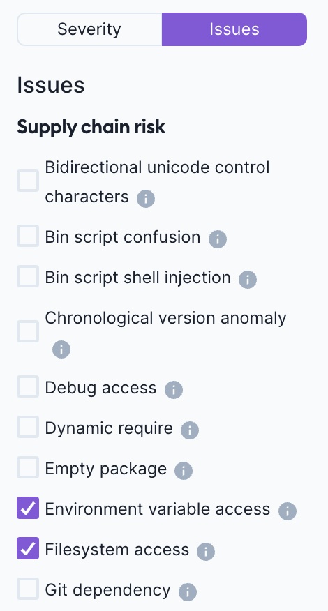 Or, you can filter to only issues of a certain type, for example “Environment variable access” and “Filesystem access”, as seen in the image above.