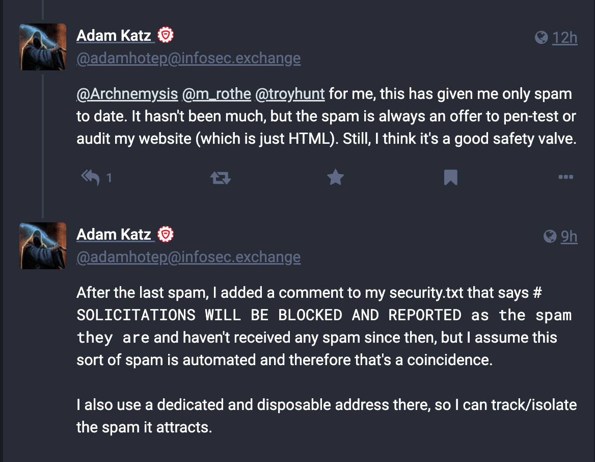 Similarly, others discussing the new feature on Mastodon said they have so far only had spam interactions after deploying a security.txt file.