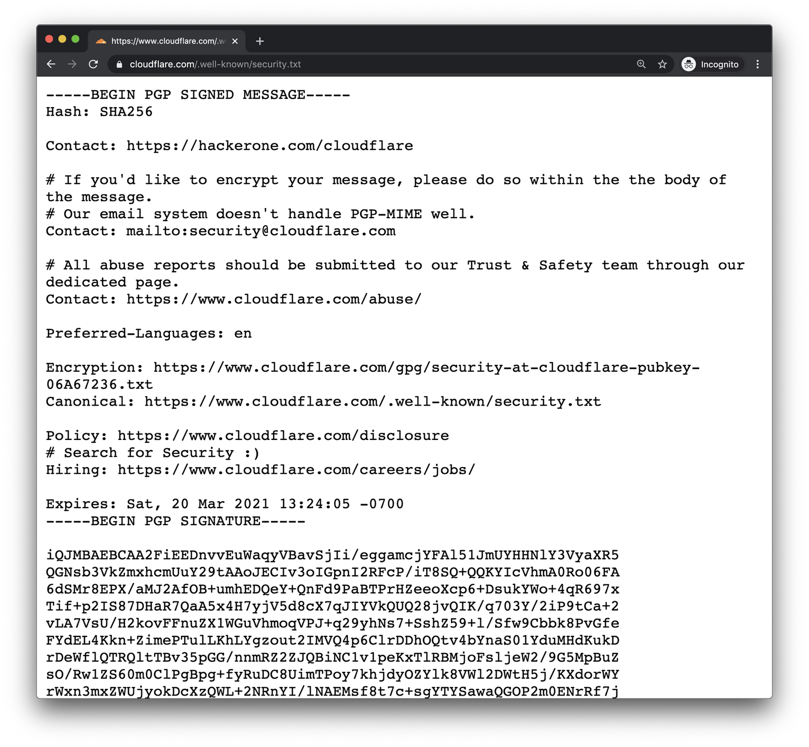 In 2020, Cloudflare launched support for the security.txt initiative through Workers, linking to their account on HackerOne for security reporting. They included a technical tutorial for deploying and updating the security.txt file through a non-trivial process but also open sourced the Worker itself for anyone who wanted to deploy this service onto their Cloudflare zone.