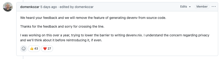 In a Lobste.rs discussion thread, one user's comment distilled the frustration from long-time supporters who were suddenly faced with what they perceived to be a potentially hostile addition to devenv: