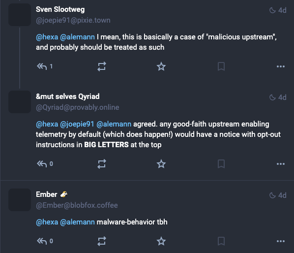 The discovery led to heated discussions across platforms like Mastodon, NixOS Discourse, and Lobste.rs. Many users expressed frustration not just over the telemetry itself but over the lack of disclosure and consent. Some community members went as far as comparing the telemetry behavior to malware, while others raised concerns about GDPR compliance.