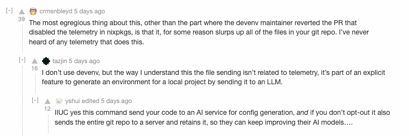 devenv users expressed concern about using the software with companies that have strict regulations on AI, which often ban applications that could potentially send their code to an external service. In a GitHub issue where the maintainer finally responded with action, contributors had suggested several options for continuing to use devenv that wouldn't put them in a compromised position, including forking the project:
