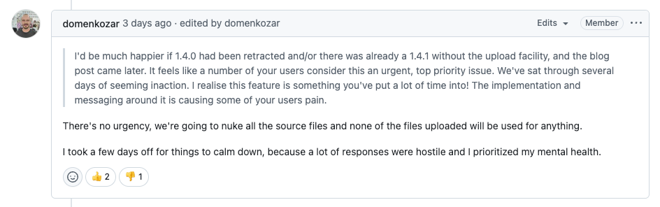 Many users expressed frustration not only with the unexpected telemetry but also with what they perceived to be Kožar’s slow response to an urgent issue, arguing that a quicker rollback or retraction of version 1.4 would have helped mitigate the risks of accidentally uploading sensitive local files to an external service. In response, Kožar promised to delete all the source files collected.