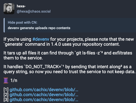 NixOS committer Martin Weinelt (@hexa-) brought attention to this issue on Mastodon, noting that the tool "tars up all files it can find through git ls-files -z and exfiltrates them to the service." The absence of a clear privacy policy and transparency about where data was sent—potentially to third-party services like Google Gemini—added to the community's unease.