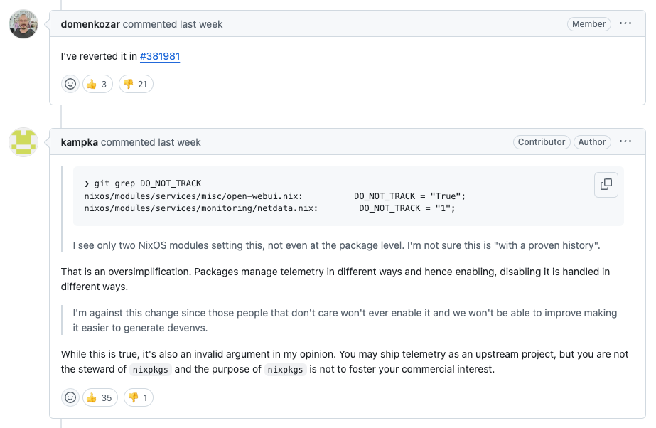 However, in a surprising turn of events, the devenv maintainer, Domen Kožar, reverted this change through PR #381981, reinstating the original telemetry behavior. This reversion was met with confusion and criticism, with some community members calling for the package to be marked as insecure or even suggesting commit privilege revocation.