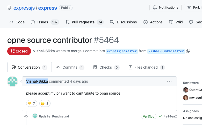 A mountain of spam PRs landed in the Express.js project repo after a popular YouTube tutorial used it as an example for contributing to open source. This put a spotlight on the mandate for job seekers to find a way to contribute to OSS.