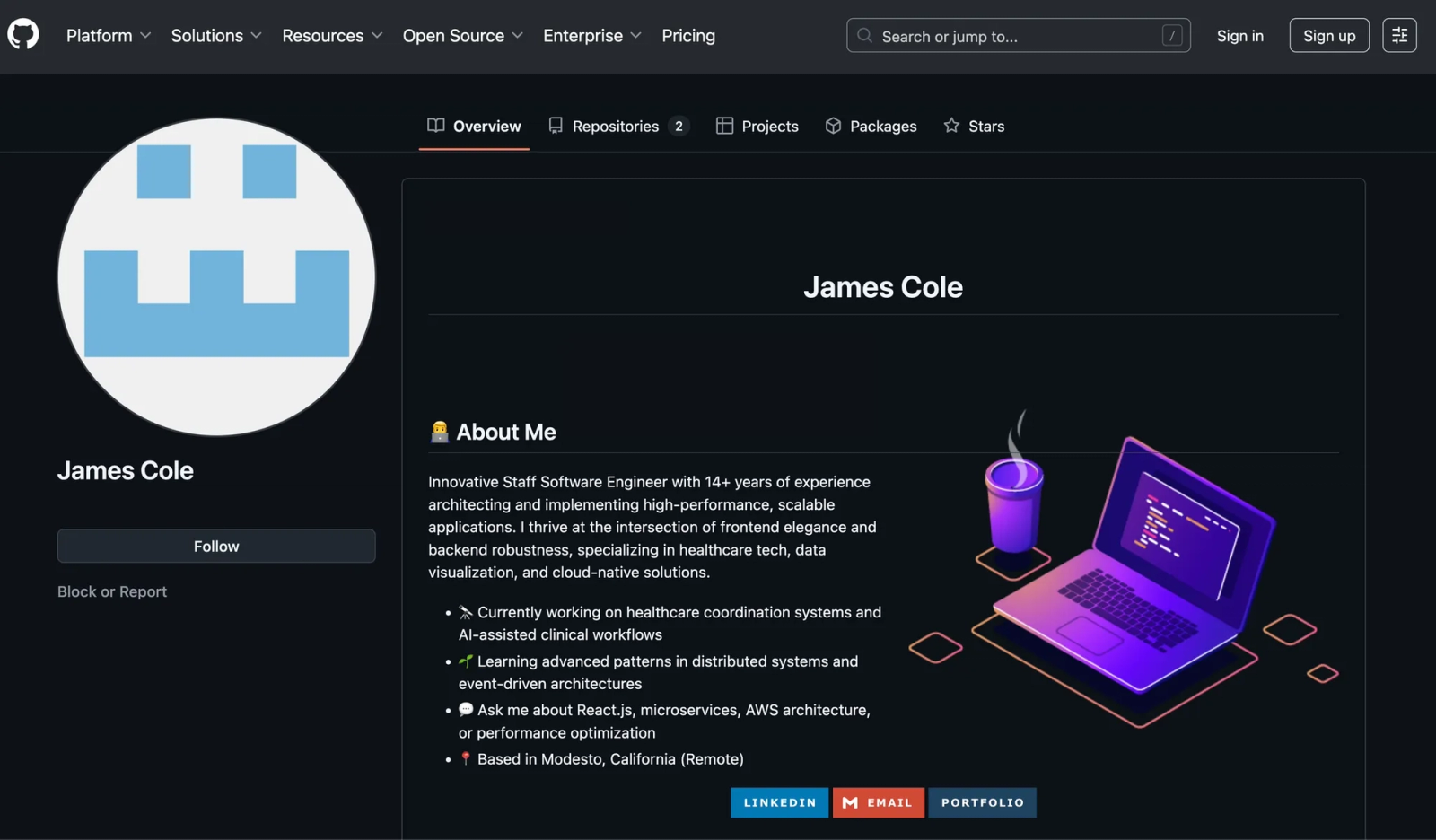 In one case we identified a suspected sock puppet GitHub profile. At the time of writing, it contained no substantive projects, only two repositories with README text asserting employment as an engineer. The profile’s outbound links returned 404s, and the supposed blog work samples either led nowhere or redirected to unrelated pages. Taken together, these signals indicate a fabricated profile created to support a fraudulent job application.