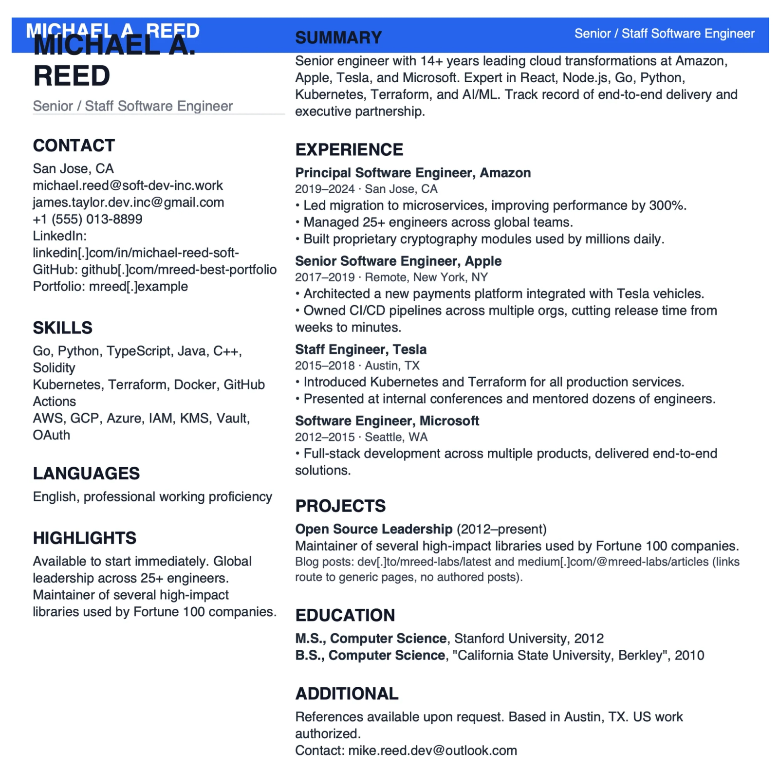 Mock resume demonstrating combined screening red flags: name-to-email mismatch with impersonation-style handles, malformed LinkedIn and GitHub links, marquee-brand stacking, unverifiable “high-impact” claims, a resume-builder fingerprint in PDF metadata, a languages section with an English-proficiency line atypical for long-claimed U.S. tenure, “Berkeley” misspelled, and no verifiable code. Taken together, these individually minor indicators create a strong triage case.