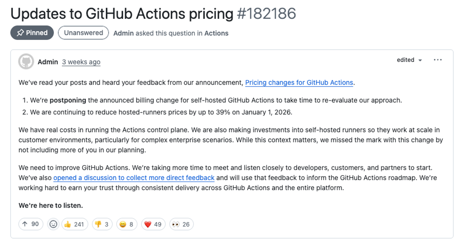 “We’ve read your posts and heard your feedback,” the company wrote, announcing that it was postponing the billing change for self-hosted GitHub Actions “to take time to re-evaluate our approach.” At the same time, GitHub confirmed it would still move forward with hosted runner price reductions on January 1.