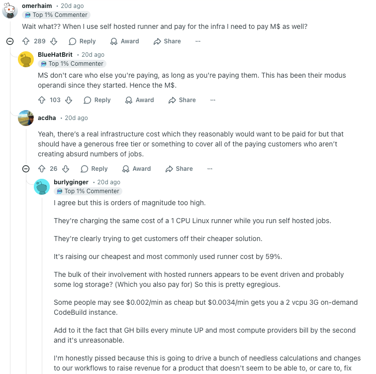 For teams that had moved to self-hosted runners specifically to control costs or performance, the proposed model felt punitive. Reddit user burlyginger described the change as “orders of magnitude too high,” arguing that GitHub was “charging the same cost of a 1 CPU Linux runner while you run self hosted jobs.”