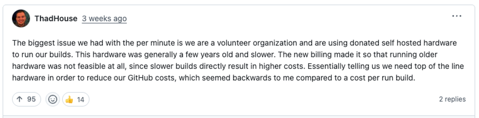 One commenter from a volunteer organization explained that they rely on donated, older machines for self-hosted runners. Under a per-minute model, slower builds would simply cost more to run. “Slower builds directly result in higher costs,” they wrote, calling the proposal backwards.