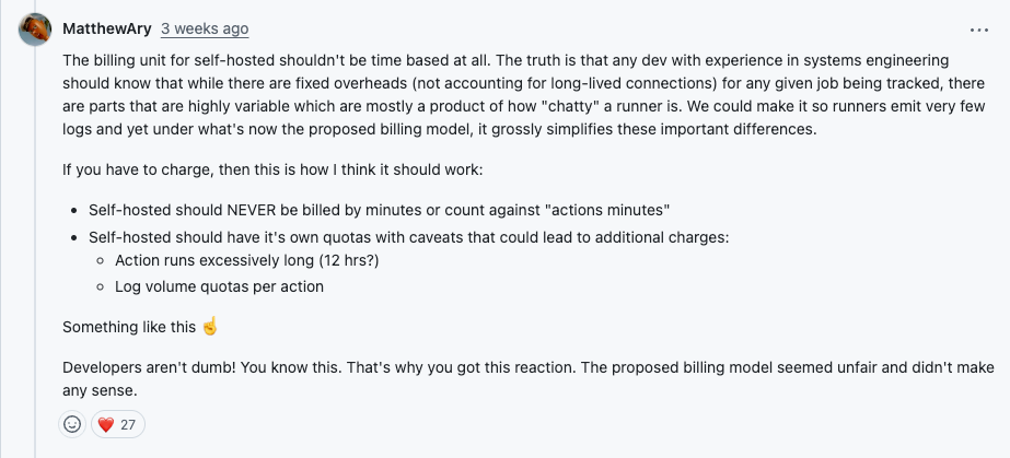 “We are already paying for the privilege of using the ‘control plane’ by paying for our GitHub accounts,” wrote one commenter. Another, Matthew Ary, contends that per-minute billing fundamentally misrepresents the costs involved, and that the billing unit for self-hosted shouldn't be time based at all.