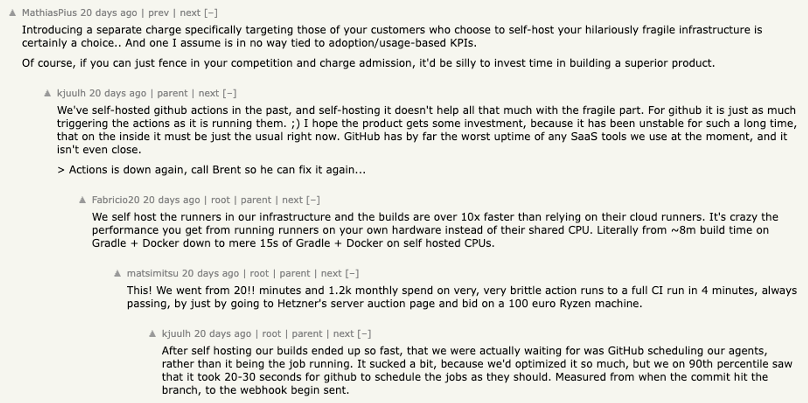 In Hacker News threads, some developers went beyond cost objections to criticize Actions’ reliability. One commenter wrote that self-hosting “doesn’t help all that much with the fragile part” of Actions, and quipped, “Actions is down again, call Brent so he can fix it again,” highlighting a perception that GitHub’s orchestration layer has been unstable compared with other tools.