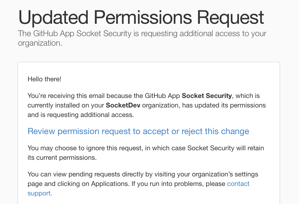 If you use Socket for GitHub and you're a GitHub organization admin, you will receive a permissions update email from Socket today.
