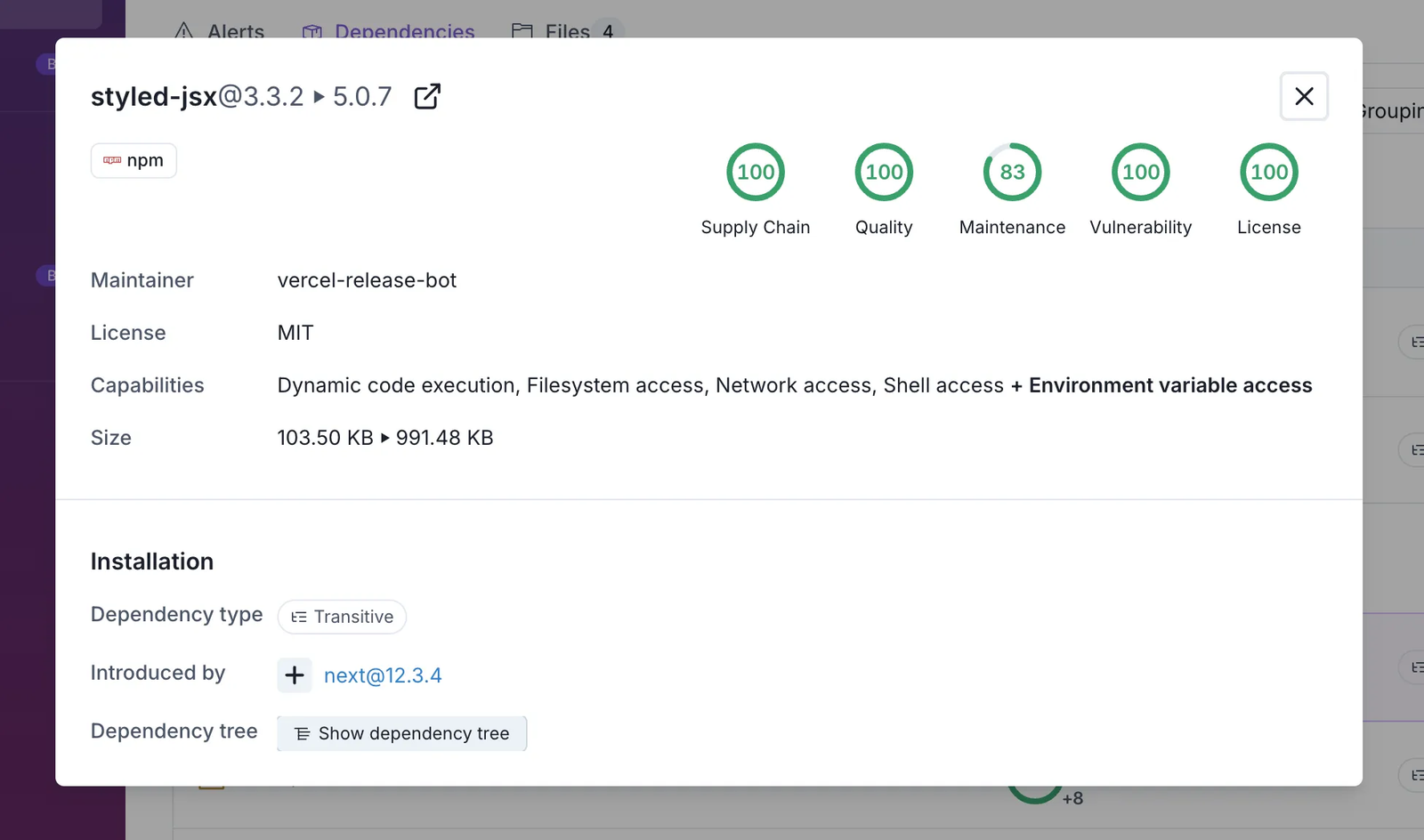 When there is a version update, we also display the change in each score. In PRs, developers review code added and code changed, and we want the workflow to remain the same, just now applied on dependencies. We show dependencies added and dependencies changed. These scores replace information such as “capabilities” and “byte size”, but we didn’t eliminate that information. You can click on one of these updated dependencies, and you will navigate to our web dashboard, which will show you the capabilities added, removed, or updated, as well as the change in byte size.