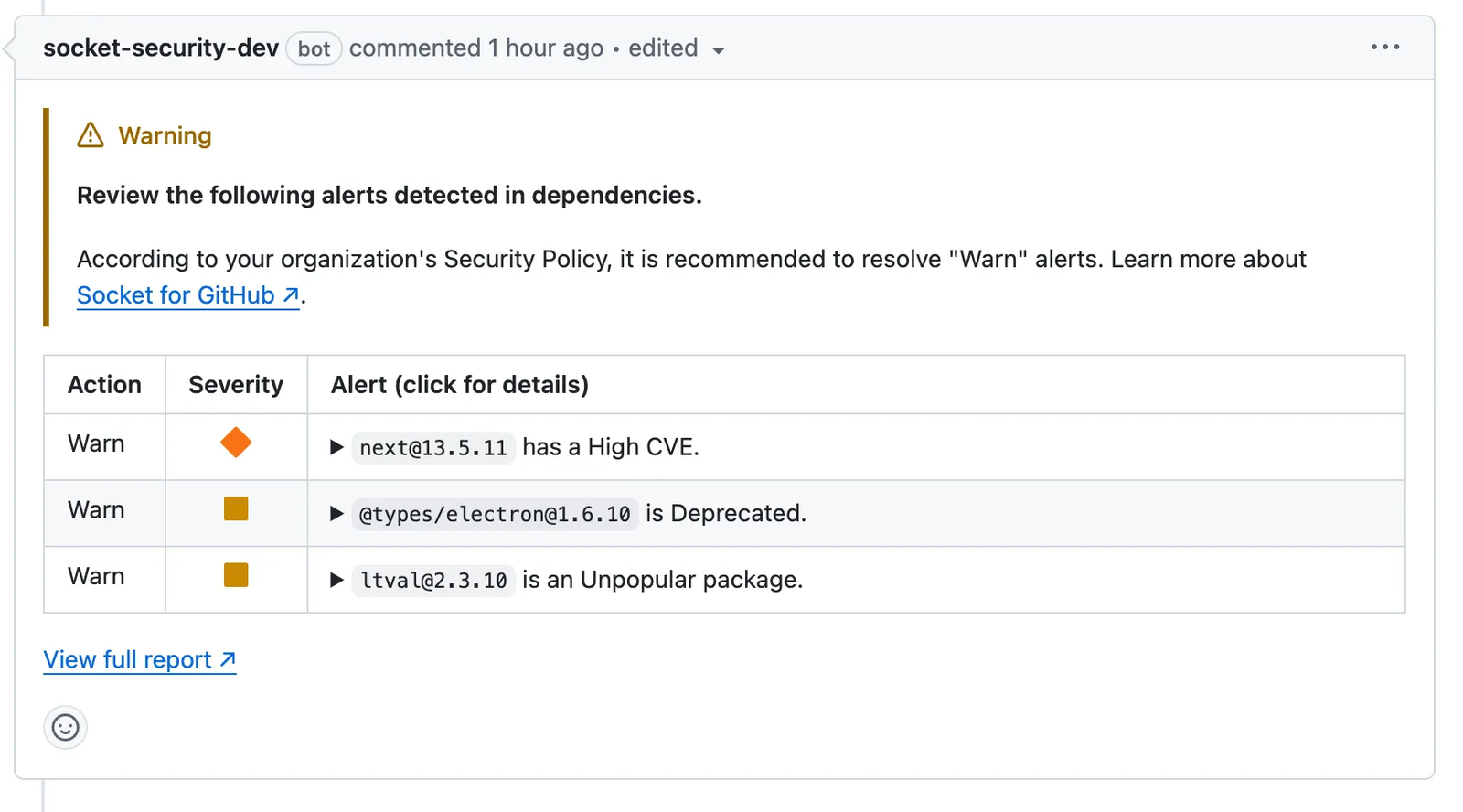 When Socket detects alerts deemed important by your organization’s Security Policy, our bot will comment on the PR too. There are two possible levels to consider: “warnings” and “blocking” alerts. Warnings are just informative and recommend the developer to resolve the alert, but the PR is allowed to be merged. A “Block”, however, prevents the PR from being merged before the alert is resolved.